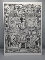 Pen and ink drawing on lined paper mounted onto A3 card.